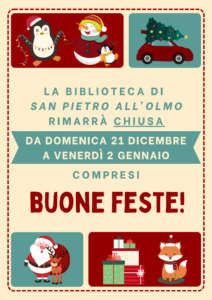 La biblioteca di S.Pietro all’Olmo sarà chiusa dal 21 dicembre al 2 gennaio compreso. Riapertura sabato 3 gennaio