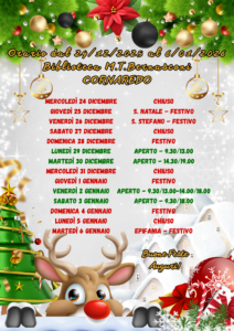 La biblioteca di Cornaredo sarà chiusa nelle date di mercoledì 24, sabato 27, mercoledì 31 dicembre e lunedì 5 gennaio. Nelle giornate non festive l’orario sarà quello consueto.