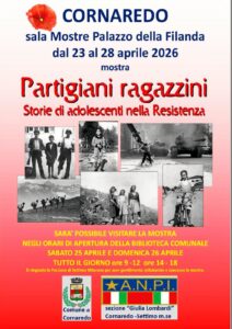 In occasione delle celebrazioni per l’Anniversario della Liberazione, l’ANPI di Cornaredo-Settimo Milanese, sezione Giulia Lombardi, espone la mostra fotografica a pannelli “Partigiani ragazzini – storie di adolescenti nella Resistenza” . Attraverso questa mostra si vuole ricordare il coraggio ed il sacrificio di tanti/e ragazzi/e che hanno lottato per sconfiggere il nazi-fascismo in Italia. La loro partecipazione alla liberazione dell’Italia ha contribuito alla vittoria della Libertà.