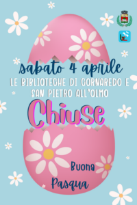 Sabato 4 aprile le biblioteche di Cornaredo e di S.Pietro all’Olmo rimarranno chiuse tutto il giorno.