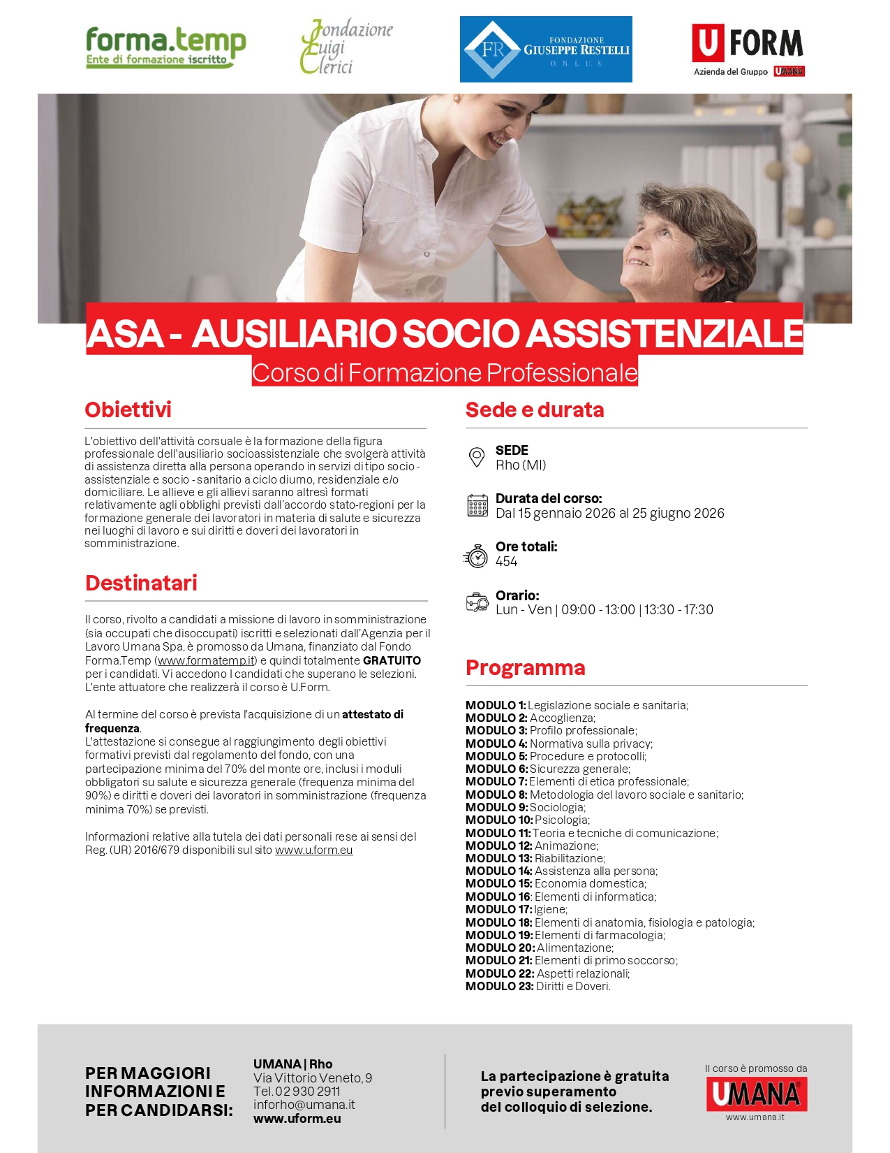 Presso la Fondazione Giuseppe Restelli Onlus di Rho (MI) prenderà avvio il corso gratuito per diventare ASA – Ausiliario Socio Assistenziale, promosso da U.Form Milano, finanziato dal fondo Forma.Temp e realizzato in collaborazione con UMANA Spa.