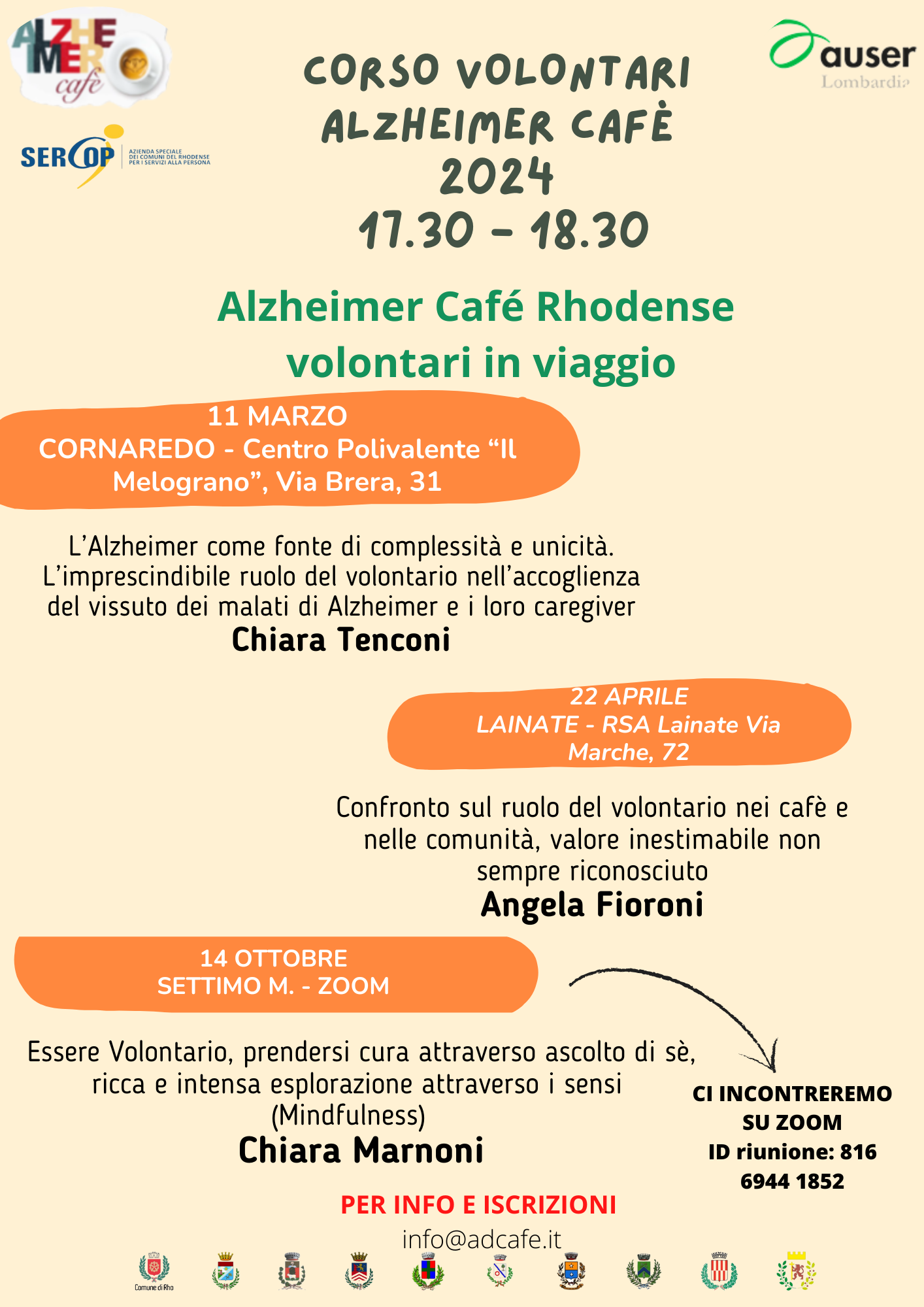 E’ in programma Lunedì 14 Ottobre 2024 l’ultimo appuntamento con il Corso Volontari Alzheimer Cafè, fruibile online tramite il portale Zoom, dalle ore 17:30 alle ore 18:30.