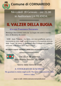 In occasione del Giorno della Memoria, istituito con L. 211 del 20 luglio 2000, “in ricordo dello sterminio e delle persecuzioni del popolo ebraico e dei deportati militari e politici italiani nei campi nazisti”, l’ufficio cultura promuove lo spettacolo teatrale “IL VALZER DELLA BUGIA” di e con Francesca Zoccarato. Monologo liberamente tratto dal libro “La bugia che salvò il mondo” di Nicoletta Bortolotti.
