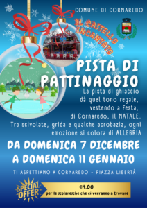 Da domenica 7 dicembre fino a domenica 11 gennaio 2026, in piazza Libertà è allestita la pista di pattinaggio su ghiaccio ed il “castello incantato” per il divertimento di grandi e piccoli. Tutti pronti a scivolare leggeri, a fare qualche acrobazia e a divertirsi per un Natale ricco di gioia ed allegria.