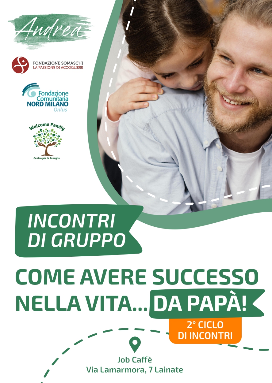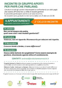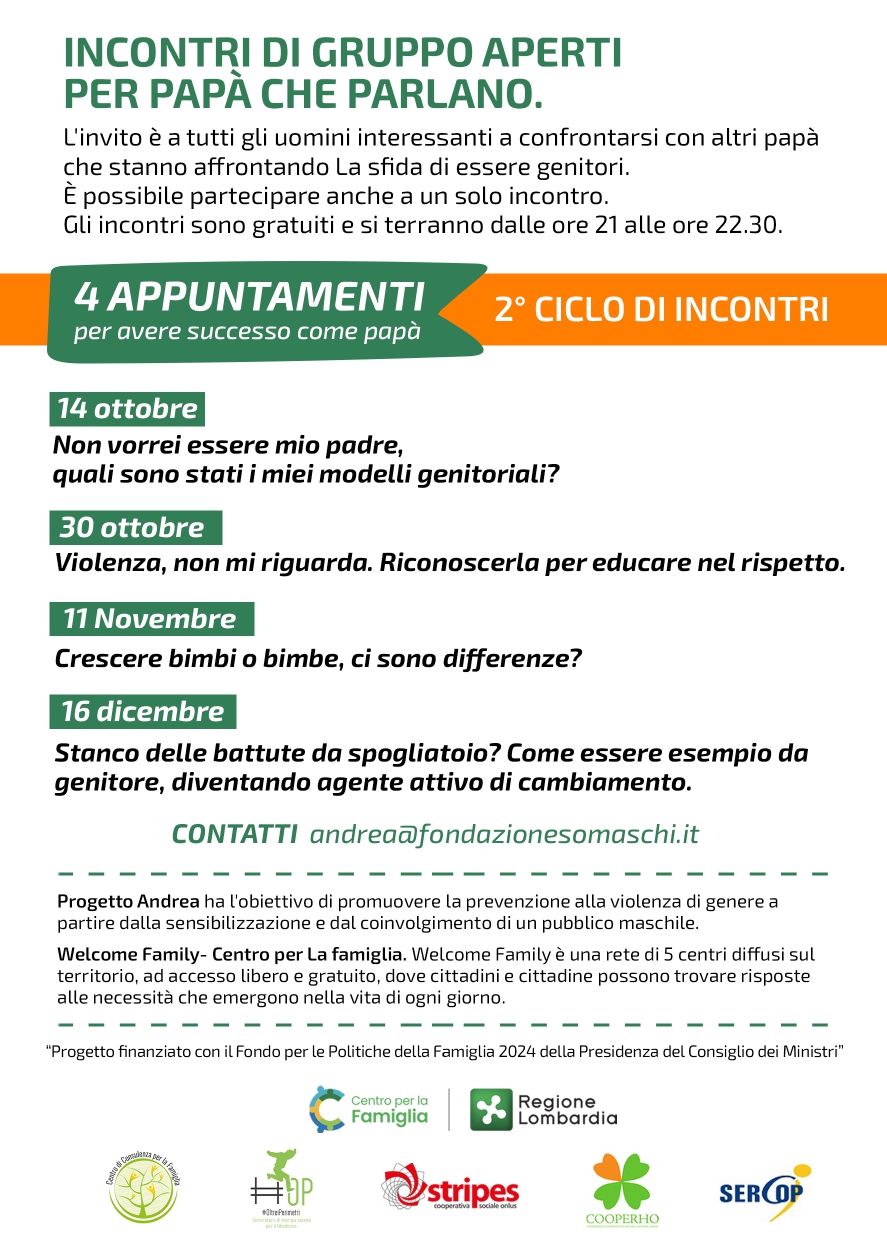 Si segnala il ritorno del 2º ciclo di incontri di gruppo per papà, promosso da Progetto Andrea e Welcome Family – Centro per la Famiglia con Ser.Cop.