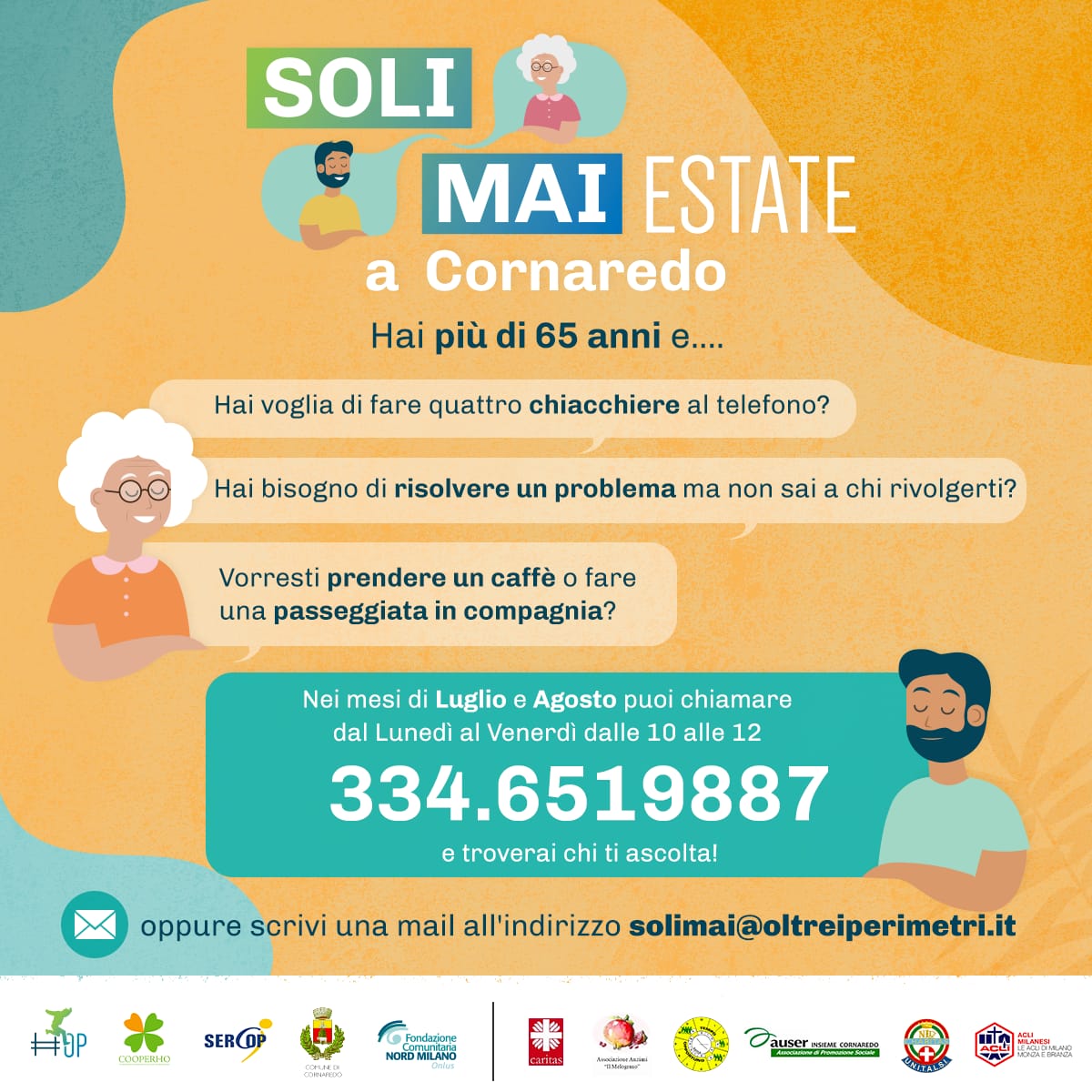 Soli Mai è nato nel 2020 nell’ambito di #Oltreiperimetri, un progetto di Welfare di Comunità del territorio del Rhodense, realizzato grazie alla collaborazione tra Cooperho – consorzio di cooperative sociali, Sercop – l’azienda speciale dei comuni del rhodense per i servizi alla persona e i Comuni dell’ambito. #Oltreiperimetri individua e mette in atto nuove modalità d’intervento e di azione sociale, a partire dal coinvolgimento di tutte le energie disponibili sul territorio.
