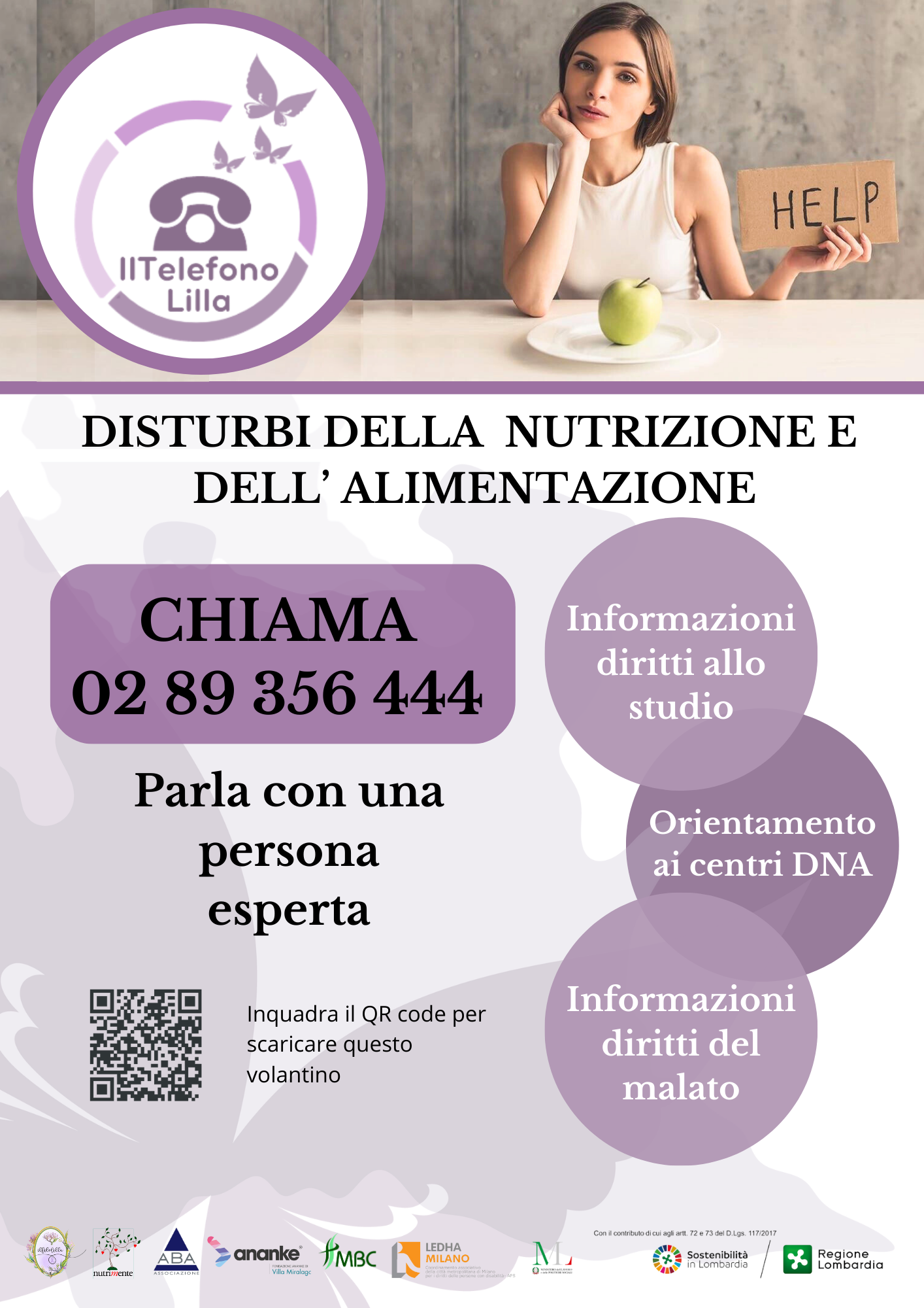 L’Associazione Ilfilolilla, con una rete di 6 associazioni*, ha attivato sul territorio di Regione Lombardia il Telefono Lilla dedicato a tutti coloro che hanno bisogno di informazioni, supporto e aiuto perché direttamente o indirettamente coinvolti da un disturbo della nutrizione e dell’alimentazione.