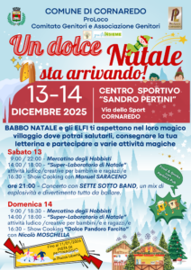 Sabato 13 e domenica 14 dicembre 2025 un dolce Natale arriva al Campo Sportivo di Cornaredo: Babbo Natale e gli elfi aspettano grandi e piccini nel loro magico villaggio, per salutarli, consegnare la letterina e soprattutto partecipare a tante fantastiche e magiche attività. E poi tanta musica e show cooking per dolci natalizi irresistibili. La manifestazione è realizzata in collaborazione con la Proloco di Cornaredo, il Comitato Genitori e l’Associazione Genitori