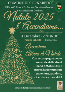 Giovedì 4 dicembre alle ore 16.00 in piazza Libertà, davanti al Municipio, prendono avvio le celebrazioni ed i festeggiamenti per il Natale 2025 a Cornaredo. Si inizia con l’accensione dell’albero di Natale e con la street band XMAS DIXIE che allieterà il pomeriggio con tanta musica allegra e ritmata. Per tutti i partecipanti ci sarà una dolce merenda con una fetta di pandoro o di panettone offerta dalla Proloco, e cioccolata o tè caldo.