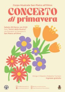 Sabato 28 marzo alle ore 21.00, presso la Sala Amici della Musica a S.Pietro all’Olmo, il Corpo Musicale di S.Pietro all’Olmo si esibisce nel tradizionale concerto di primavera, per dare il benvenuto alla nuova stagione.