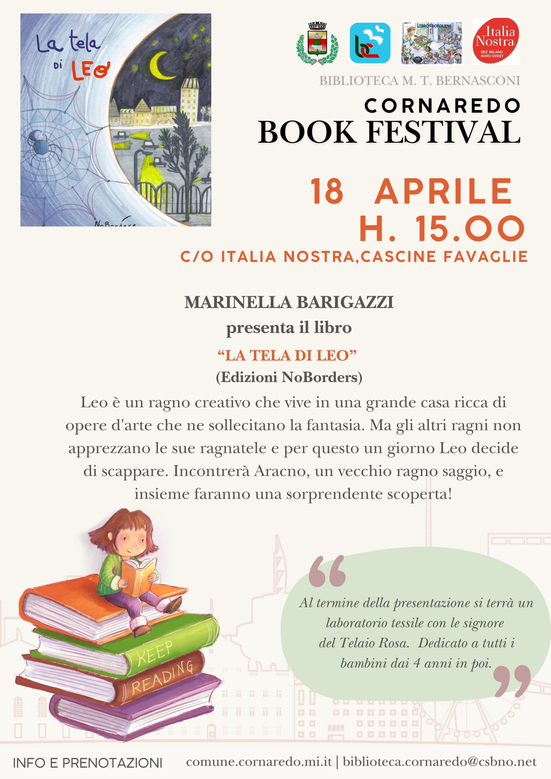 La presentazione di “La tela di Leo” con l’autrice Marinella Barigazzi rientra nell’ambito del Cornaredo Book Festival – edizione 2026. Si svolgerà anche in caso di maltempo