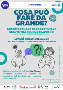 Lunedì 1 dicembre 2025 alle ore 20:30, presso la Sala Mostre del Palazzo “La Filanda” – Piazza Libertà, Cornaredo (MI), si terrà l’incontro “Cosa può fare da grande?”, rivolto ai genitori di figli tra i 16 e i 25 anni.