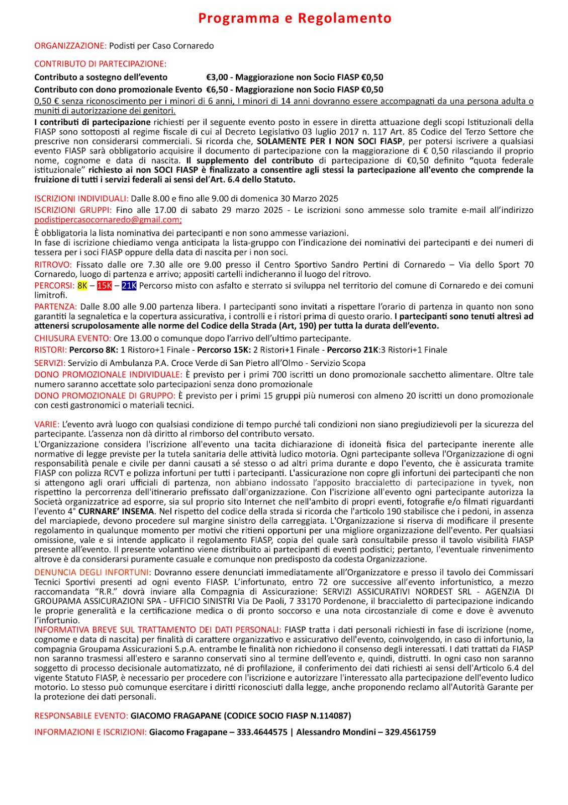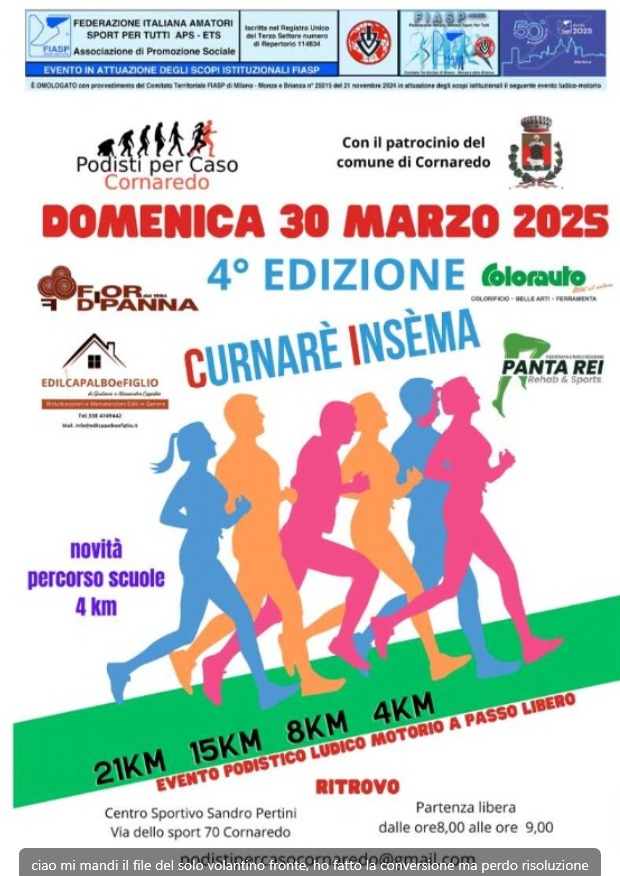 Domenica 30 marzo 2025 si terrà la Manifestazione Ludico Motoria a passo libero denominata CURNARE’ INSEMA, organizzata da Podisti per Caso, con il patrocinio dell’Amministrazione Comunale di Cornaredo e con l’assistenza della F.I.A.S.P. (Federazione Italiana Amatori Sport per Tutti).