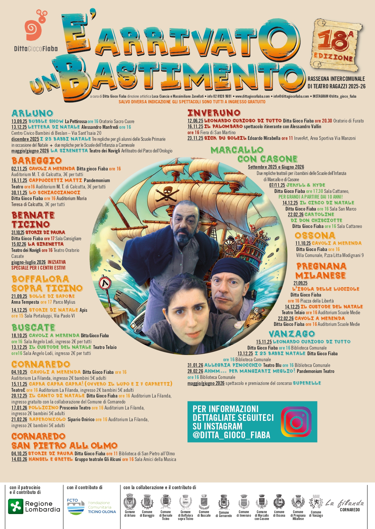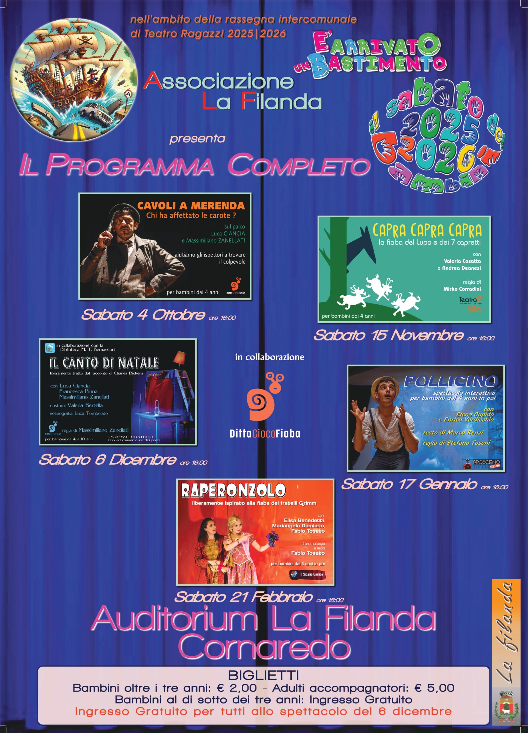 Sabato 20 dicembre 2025, alle ore 16:00, presso l’Auditorium La Filanda – Piazza Libertà, Cornaredo, torna la rassegna intercomunale “Il Sabato dei Bambini” e “È arrivato un bastimento” con uno spettacolo imperdibile: