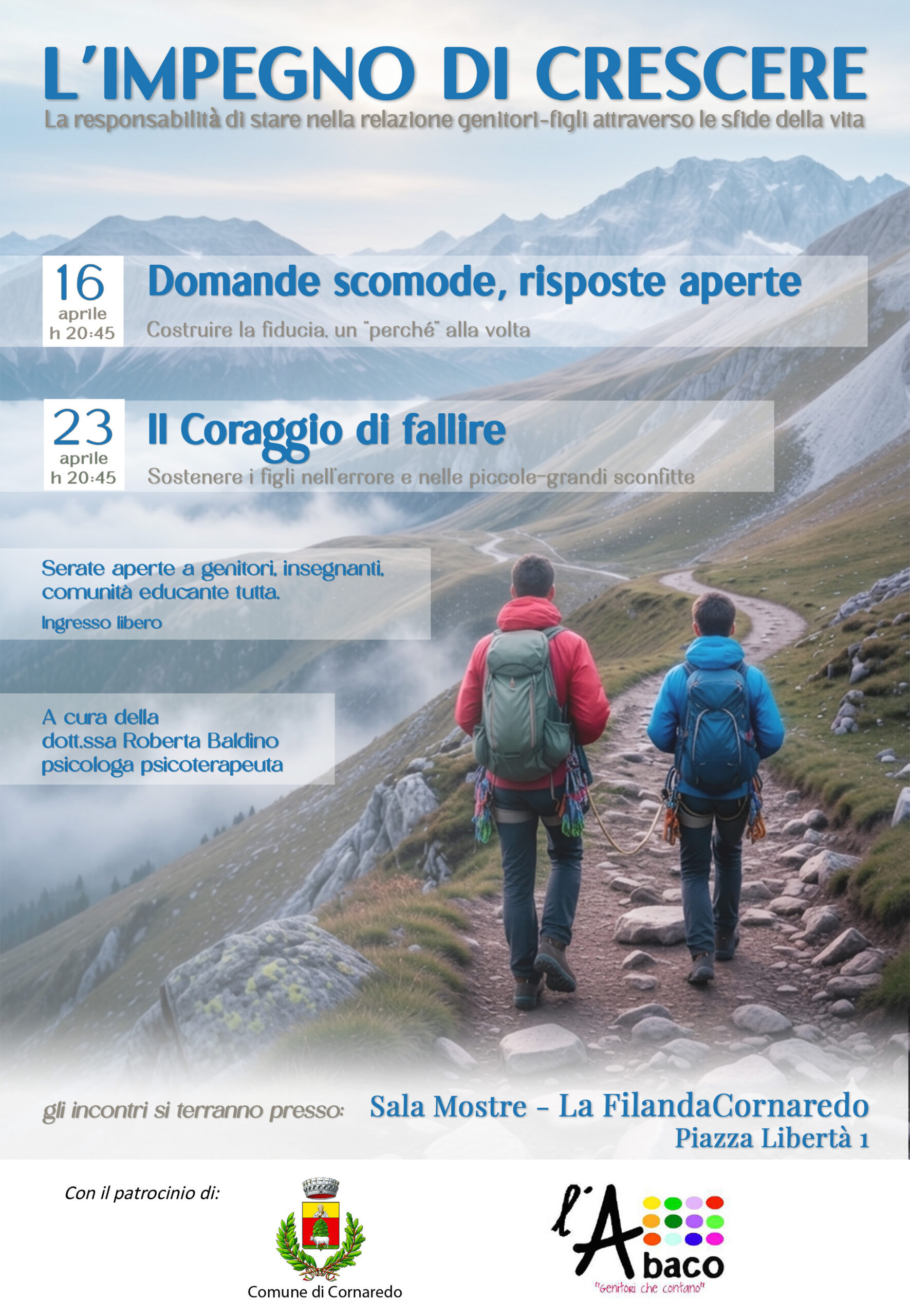 Dopo il ciclo di incontri Affettiva-mente, l’iniziativa prosegue con due serate di approfondimento dedicate al tema “L’impegno di crescere”, un percorso di riflessione sulla responsabilità di stare nella relazione genitori–figli, attraversando insieme le sfide, le fatiche e le opportunità che la vita quotidiana propone.