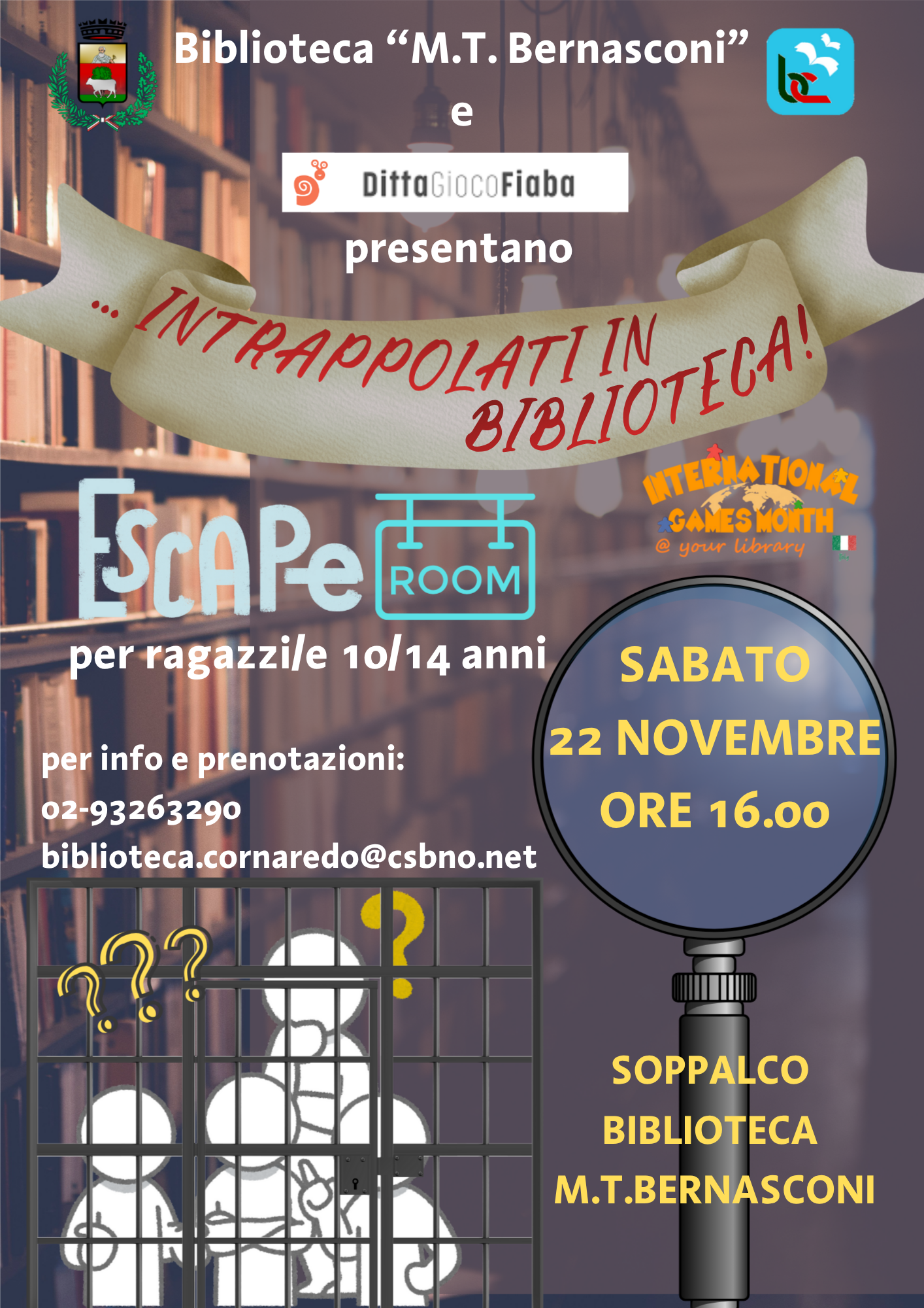 Dalle 16.00 “Intrappolati in biblioteca“: l’escape room per ragazzi/e dai 10 ai 14 anni, che guidati dagli attori della “Ditta Gioco Fiaba” dovranno usare intelligenza e fantasia per “fuggire” dalla biblioteca nel minor tempo possibile. Da non perdere!